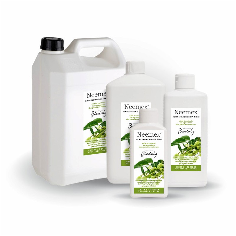 Produit à usage externe. Bouteilles en plastique recyclé. A transvaser dans un pulvérisateur, agiter avant emploi, puis pulvériser, ou appliquer avec un chiffon, toujours le Neemex® pure la première fois et diluer à 50% les fois suivantes. Après un bain renouveler l’application.